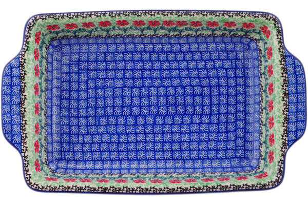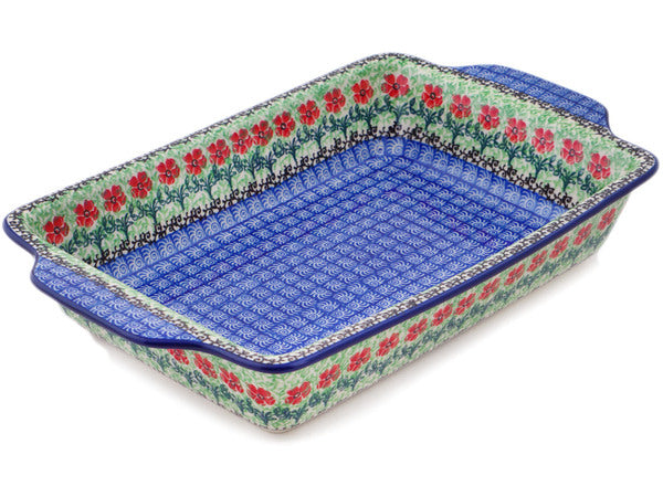 This Polish pottery Rectangular Baker with Handles is made by Ceramika Artystyczna workshop in Boleslawiec, Poland. Manufacturer item number H5841Q. It is 2¼" high and measures 13" by 7¾". The capacity of this Rectangular Baker with Handles is 59.0 oz when filled to rim and it weighs 2.7 lbs. The pattern was designed by artist Irena Mączka. It is part of the Maraschino Collection.