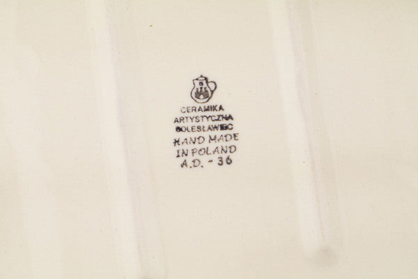 This Polish pottery Rectangular Baker is made by Ceramika Artystyczna workshop in Boleslawiec, Poland. Manufacturer item number H5111Q. It is 2¾" high and measures 13¾" by 11¼". The capacity of this Rectangular Baker is 100.9 oz when filled to rim and it weighs 4.8 lbs. The pattern was designed by artist Maria Starzyk. It is part of the Blue Bud Sea Collection.