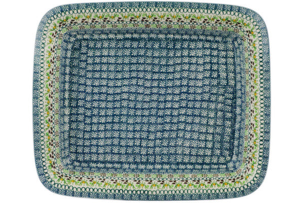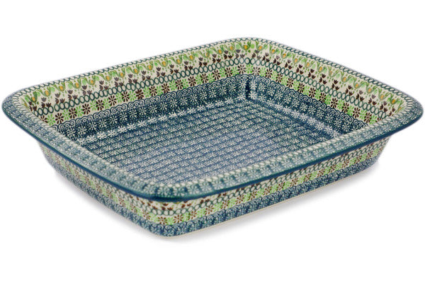 This Polish pottery Rectangular Baker is made by Ceramika Artystyczna workshop in Boleslawiec, Poland. Manufacturer item number H6086Q. It is 2¾" high and measures 13¾" by 11¼". The capacity of this Rectangular Baker is 100.9 oz when filled to rim and it weighs 4.8 lbs. It is part of the Green Fulfillment Collection.