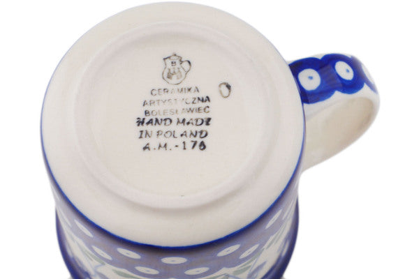 This Polish pottery Mug is made by Ceramika Artystyczna workshop in Boleslawiec, Poland. Manufacturer item number H4856Q. It is 4½" high and measures 5" by 3¾". The capacity of this Mug is 15.2 oz when filled to rim and it weighs 1.1 lbs. The pattern was designed by artist Maria Ciszewska. It is part of the Bleeding Heart Peacock Collection.