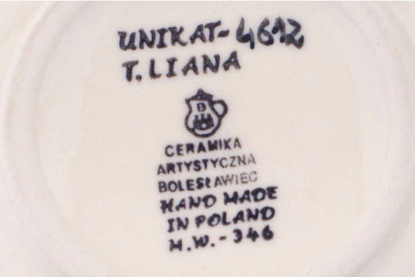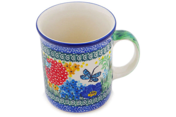 This Polish pottery Mug is made by Ceramika Artystyczna workshop in Boleslawiec, Poland. Manufacturer item number H6907Q. It is 4½" high and measures 5" by 3¾". The capacity of this Mug is 15.2 oz when filled to rim and it weighs 1.1 lbs. The pattern was designed by artist Teresa Liana. It is part of the Dragonfly Delight Collection.