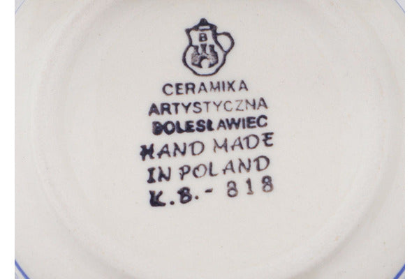 This Polish pottery Mug is made by Ceramika Artystyczna workshop in Boleslawiec, Poland. Manufacturer item number H5670Q. It is 4½" high and measures 5" by 3¾". The capacity of this Mug is 15.2 oz when filled to rim and it weighs 1.1 lbs. The pattern was designed by artist Maria Starzyk. It is part of the Petite Blue Vine Collection.
