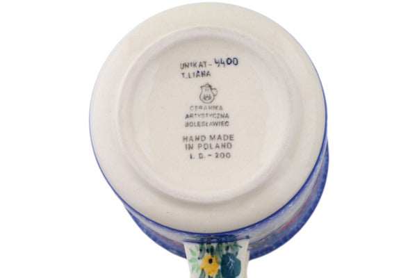 This Polish pottery Mug is made by Ceramika Artystyczna workshop in Boleslawiec, Poland. Manufacturer item number H6854Q. It is 4½" high and measures 5" by 3¾". The capacity of this Mug is 15.2 oz when filled to rim and it weighs 1.1 lbs. The pattern was designed by artist Teresa Liana. It is part of the Splendid Meadow Collection.