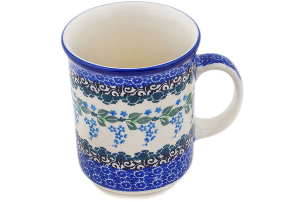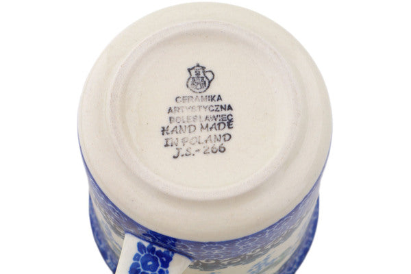 This Polish pottery Mug is made by Ceramika Artystyczna workshop in Boleslawiec, Poland. Manufacturer item number H5417Q. It is 4½" high and measures 5" by 3¾". The capacity of this Mug is 15.2 oz when filled to rim and it weighs 1.1 lbs. The pattern was designed by artist Maria Starzyk. It is part of the Wisteria Collection.