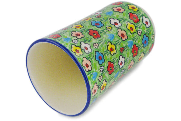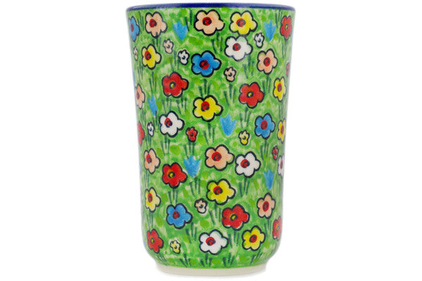 This Polish pottery Tumbler is made by Ceramika Artystyczna workshop in Boleslawiec, Poland. Manufacturer item number H3195R. It is 5" high and measures 3¼" by 3¼". The capacity of this Tumbler is 15.2 oz when filled to rim and it weighs 0.9 lbs. It is part of the Whimsical Garden Collection.
