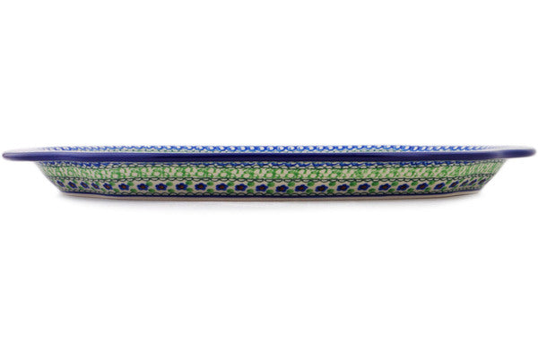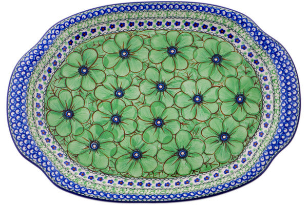 This Polish pottery Platter is made by Ceramika Artystyczna workshop in Boleslawiec, Poland. Manufacturer item number H6811Q. It is 1½" high and measures 15½" by 11½". The weight of this Platter is 3.1 lbs. The pattern was designed by artist Jacek Chyla. It is part of the Green Pansies Collection.