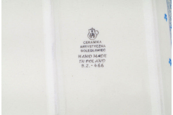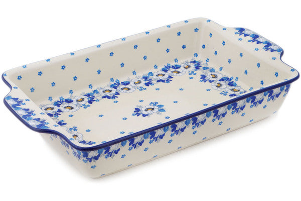 This Polish pottery Rectangular Baker with Handles is made by Ceramika Artystyczna workshop in Boleslawiec, Poland. Manufacturer item number H6110Q. It is 2½" high and measures 15¼" by 9". The capacity of this Rectangular Baker with Handles is 100.3 oz when filled to rim and it weighs 5.2 lbs. It is part of the Blue Spring Collection.