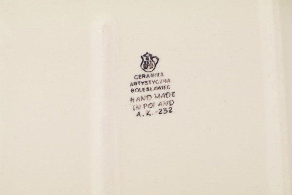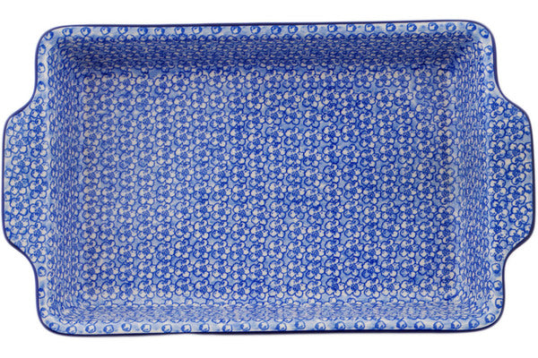 This Polish pottery Rectangular Baker with Handles is made by Ceramika Artystyczna workshop in Boleslawiec, Poland. Manufacturer item number H6035Q. It is 2½" high and measures 15¼" by 9". The capacity of this Rectangular Baker with Handles is 100.3 oz when filled to rim and it weighs 5.2 lbs. It is part of the Magical Blue Collection.