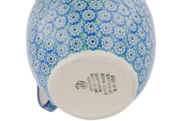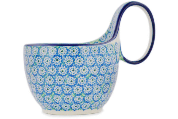 This Polish pottery Bowl with Loop-Handle is made by Ceramika Artystyczna workshop in Boleslawiec, Poland. Manufacturer item number H4528R. It is 5½" high and measures 6¼" by 4½". The capacity of this Bowl with Loop-Handle is 15.8 oz when filled to rim and it weighs 1.1 lbs. The pattern was designed by artist Starzyk.