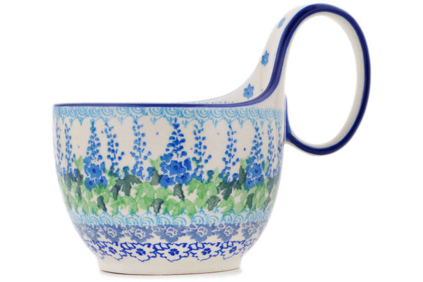 This Polish pottery Bowl with Loop-Handle is made by Ceramika Artystyczna workshop in Boleslawiec, Poland. Manufacturer item number H2806R. It is 5½" high and measures 6¼" by 4½". The capacity of this Bowl with Loop-Handle is 15.8 oz when filled to rim and it weighs 1.1 lbs. It is part of the Light Blue Lupine Collection.