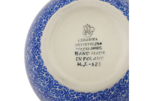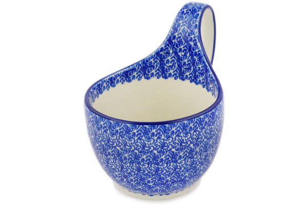 This Polish pottery Bowl with Loop-Handle is made by Ceramika Artystyczna workshop in Boleslawiec, Poland. Manufacturer item number H7447Q. It is 5½" high and measures 6¼" by 4½". The capacity of this Bowl with Loop-Handle is 15.8 oz when filled to rim and it weighs 1.1 lbs.
