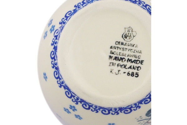 This Polish pottery Bowl with Loop-Handle is made by Ceramika Artystyczna workshop in Boleslawiec, Poland. Manufacturer item number H5757R. It is 5½" high and measures 6¼" by 4½". The capacity of this Bowl with Loop-Handle is 15.8 oz when filled to rim and it weighs 1.1 lbs.