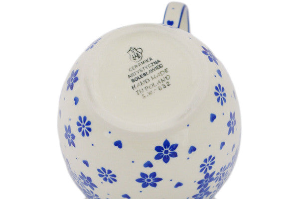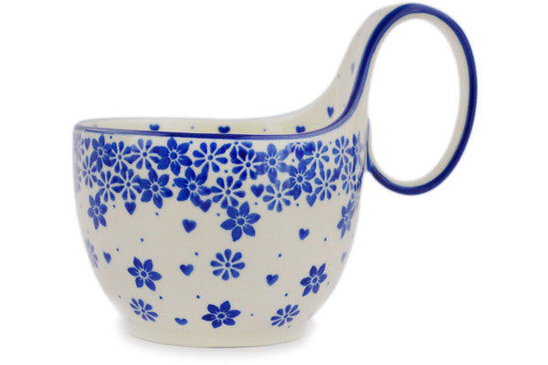 This Polish pottery Bowl with Loop-Handle is made by Ceramika Artystyczna workshop in Boleslawiec, Poland. Manufacturer item number H5744R. It is 5½" high and measures 6¼" by 4½". The capacity of this Bowl with Loop-Handle is 15.8 oz when filled to rim and it weighs 1.1 lbs.