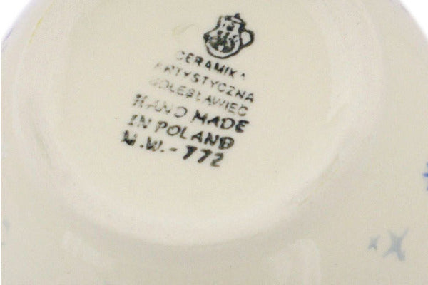 This Polish pottery Bowl with Loop-Handle is made by Ceramika Artystyczna workshop in Boleslawiec, Poland. Manufacturer item number H5746R. It is 5½" high and measures 6¼" by 4½". The capacity of this Bowl with Loop-Handle is 15.8 oz when filled to rim and it weighs 1.1 lbs.