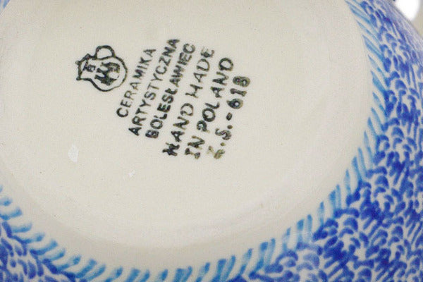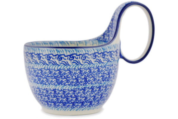 This Polish pottery Bowl with Loop-Handle is made by Ceramika Artystyczna workshop in Boleslawiec, Poland. Manufacturer item number H7431Q. It is 5½" high and measures 6¼" by 4½". The capacity of this Bowl with Loop-Handle is 15.8 oz when filled to rim and it weighs 1.1 lbs.