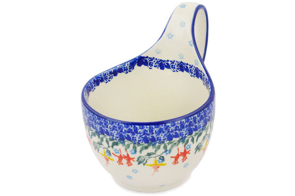 This Polish pottery Bowl with Loop-Handle is made by Ceramika Artystyczna workshop in Boleslawiec, Poland. Manufacturer item number H6186R. It is 5½" high and measures 6¼" by 4½". The capacity of this Bowl with Loop-Handle is 15.8 oz when filled to rim and it weighs 1.1 lbs. The pattern was designed by artist Śliwińska.