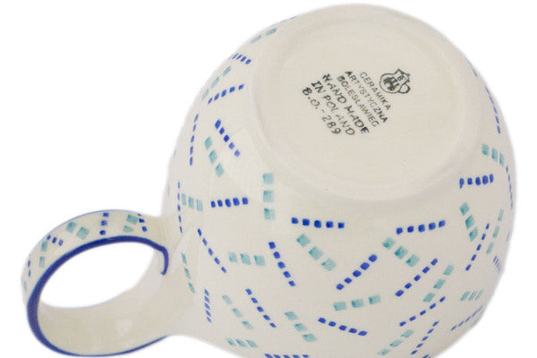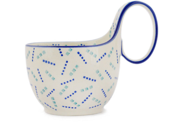 This Polish pottery Bowl with Loop-Handle is made by Ceramika Artystyczna workshop in Boleslawiec, Poland. Manufacturer item number H7463Q. It is 5½" high and measures 6¼" by 4½". The capacity of this Bowl with Loop-Handle is 15.8 oz when filled to rim and it weighs 1.1 lbs.