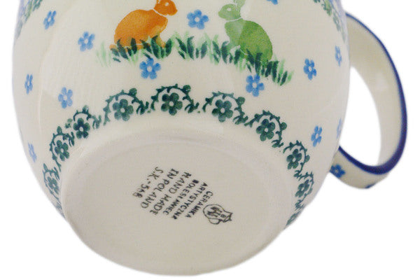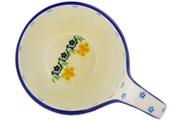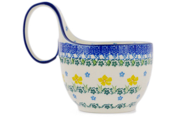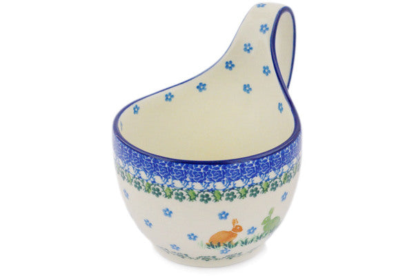 This Polish pottery Bowl with Loop-Handle is made by Ceramika Artystyczna workshop in Boleslawiec, Poland. Manufacturer item number H8981Q. It is 5½" high and measures 6¼" by 4½". The capacity of this Bowl with Loop-Handle is 15.8 oz when filled to rim and it weighs 1.1 lbs. It is part of the Happy Hares Collection.