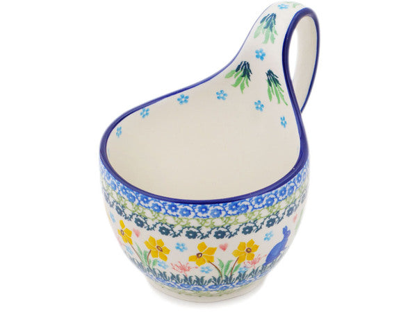 This Polish pottery Bowl with Loop-Handle is made by Ceramika Artystyczna workshop in Boleslawiec, Poland. Manufacturer item number H9021Q. It is 5½" high and measures 6¼" by 4½". The capacity of this Bowl with Loop-Handle is 15.8 oz when filled to rim and it weighs 1.1 lbs. It is part of the Hopping In Love Collection.