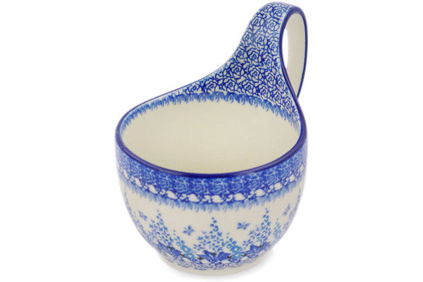 This Polish pottery Bowl with Loop-Handle is made by Ceramika Artystyczna workshop in Boleslawiec, Poland. Manufacturer item number H5748R. It is 5½" high and measures 6¼" by 4½". The capacity of this Bowl with Loop-Handle is 15.8 oz when filled to rim and it weighs 1.1 lbs. It is part of the Powder Blue Butterflies Collection.