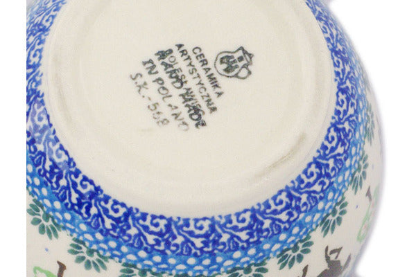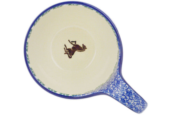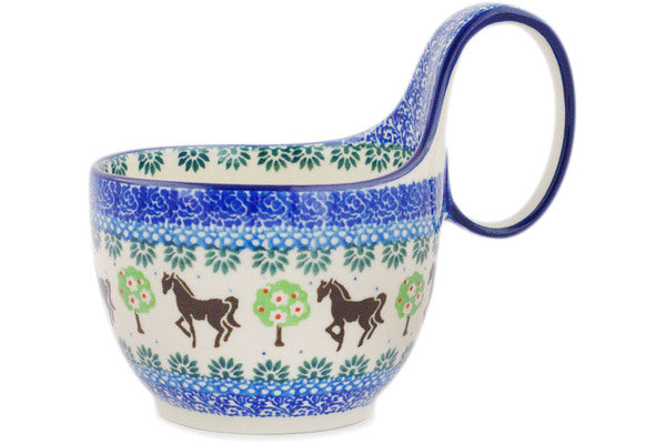 This Polish pottery Bowl with Loop-Handle is made by Ceramika Artystyczna workshop in Boleslawiec, Poland. Manufacturer item number H6153Q. It is 5½" high and measures 6¼" by 4½". The capacity of this Bowl with Loop-Handle is 15.8 oz when filled to rim and it weighs 1.1 lbs. It is part of the Stallion Trot Collection.