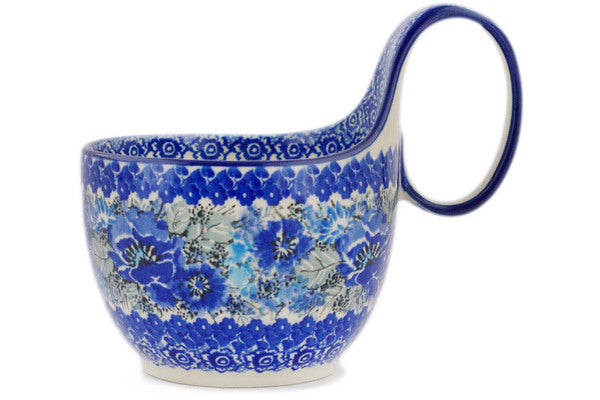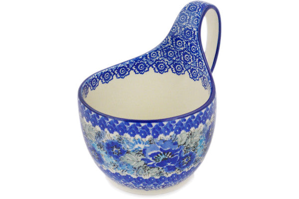 This Polish pottery Bowl with Loop-Handle is made by Ceramika Artystyczna workshop in Boleslawiec, Poland. Manufacturer item number H6172R. It is 5½" high and measures 6¼" by 4½". The capacity of this Bowl with Loop-Handle is 15.8 oz when filled to rim and it weighs 1.1 lbs. The pattern was designed by artist Starzyk.