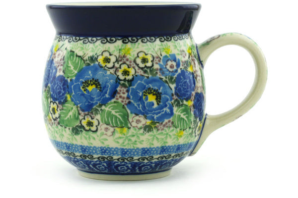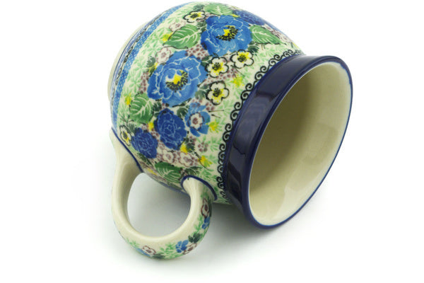 This Polish pottery Bubble Mug is made by Ceramika Artystyczna workshop in Boleslawiec, Poland. Manufacturer item number H2160H. It is 4" high and measures 5½" by 4". The capacity of this Bubble Mug is 16.0 oz when filled to rim and it weighs 1.0 lbs. The pattern was designed by artist Maria Starzyk. It is part of the Bright Petals Collection.