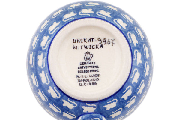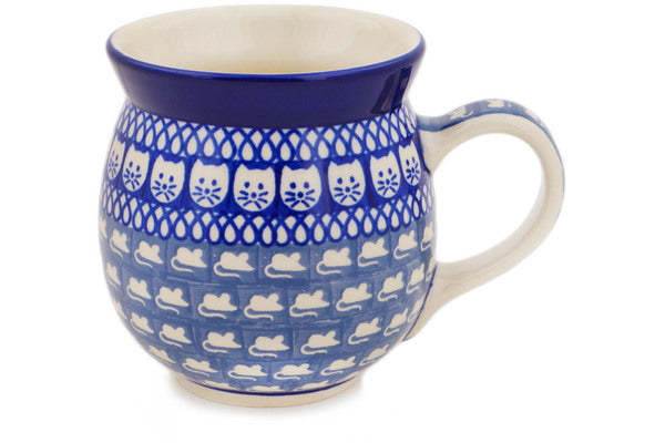 This Polish pottery Bubble Mug is made by Ceramika Artystyczna workshop in Boleslawiec, Poland. Manufacturer item number H7251Q. It is 4" high and measures 5½" by 4". The capacity of this Bubble Mug is 16.0 oz when filled to rim and it weighs 1.0 lbs. The pattern was designed by artist Maria Iwicka. It is part of the Cat And Mouse Brigade Collection.