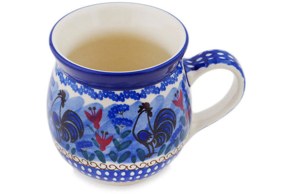 This Polish pottery Bubble Mug is made by Ceramika Artystyczna workshop in Boleslawiec, Poland. Manufacturer item number H7853Q. It is 4" high and measures 5½" by 4". The capacity of this Bubble Mug is 16.0 oz when filled to rim and it weighs 1.0 lbs. The pattern was designed by artist Monika Kuczyńska. It is part of the Midnight Rooster Collection.