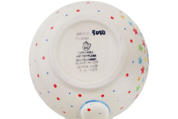 This Polish pottery Bubble Mug is made by Ceramika Artystyczna workshop in Boleslawiec, Poland. Manufacturer item number H7935Q. It is 4" high and measures 5½" by 4". The capacity of this Bubble Mug is 16.0 oz when filled to rim and it weighs 1.0 lbs. The pattern was designed by artist TERESA LIANA. It is part of the Sparkling Holiday Collection.