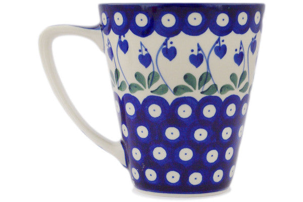 This Polish pottery Mug is made by Ceramika Artystyczna workshop in Boleslawiec, Poland. Manufacturer item number H9916Q. It is 4¾" high and measures 5¾" by 4". The capacity of this Mug is 16.4 oz when filled to rim and it weighs 1.1 lbs. The pattern was designed by artist Maria Ciszewska. It is part of the Bleeding Heart Peacock Collection.