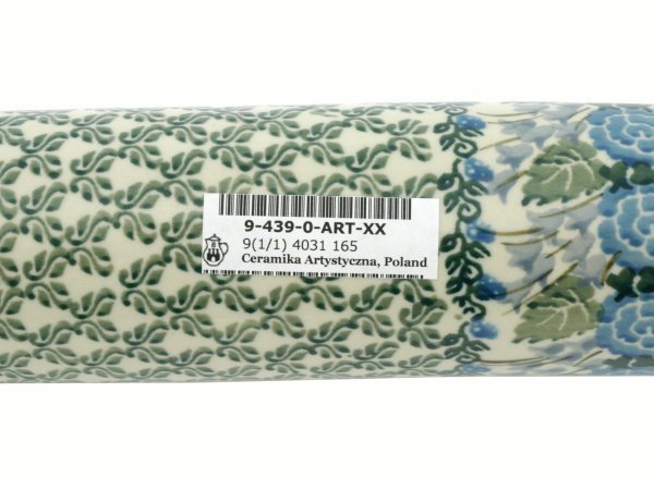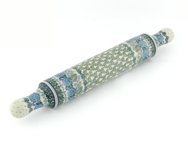 This Polish pottery Rolling Pin is made by Ceramika Artystyczna workshop in Boleslawiec, Poland. Manufacturer item number H8501C. It is 2½" high and measures 18" by 2½". The weight of this Rolling Pin is 1.3 lbs. The pattern was designed by artist Teresa Liana. It is part of the Blue Rose Trellis Collection.