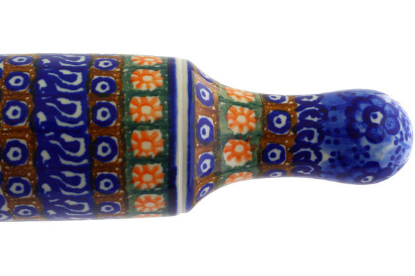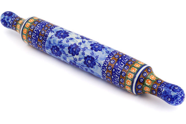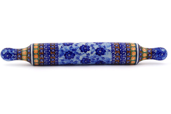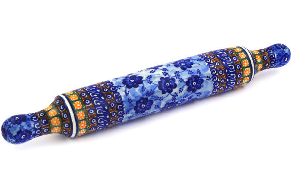 This Polish pottery Rolling Pin is made by Ceramika Artystyczna workshop in Boleslawiec, Poland. Manufacturer item number H6295F. It is 2½" high and measures 18" by 2½". The weight of this Rolling Pin is 1.3 lbs. The pattern was designed by artist Anna Pasierbiewicz. It is part of the Dancing Blue Poppies Collection.
