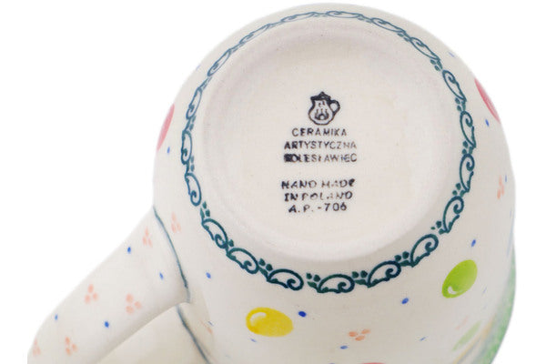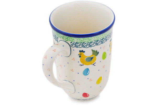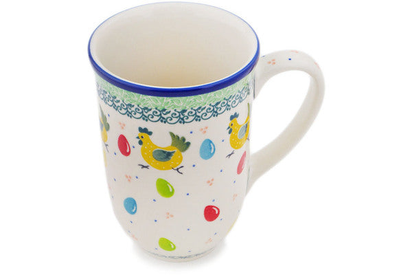 This Polish pottery Mug is made by Ceramika Artystyczna workshop in Boleslawiec, Poland. Manufacturer item number H9102Q. It is 5½" high and measures 5½" by 3¾". The capacity of this Mug is 19.1 oz when filled to rim and it weighs 1.1 lbs. It is part of the Egg Hunt Collection.