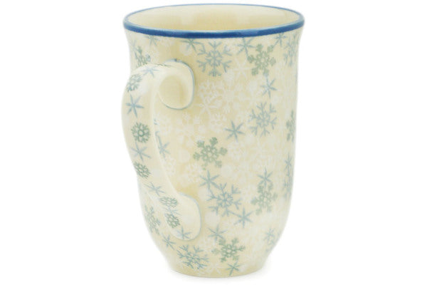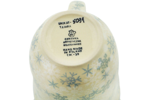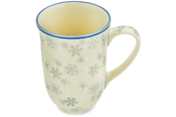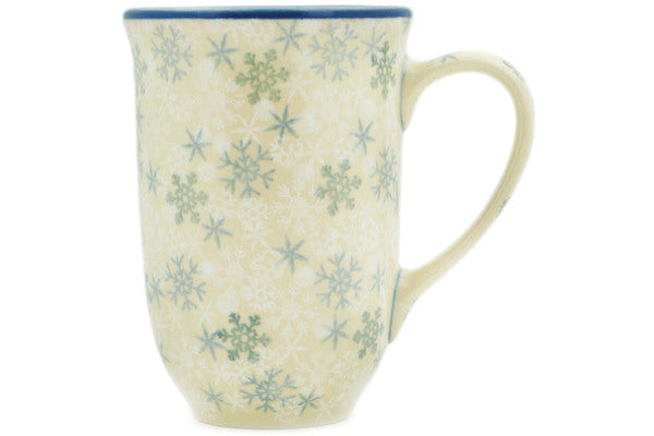 This Polish pottery Mug is made by Ceramika Artystyczna workshop in Boleslawiec, Poland. Manufacturer item number H1210M. It is 5½" high and measures 5½" by 3¾". The capacity of this Mug is 19.1 oz when filled to rim and it weighs 1.1 lbs. The pattern was designed by artist TERESA LIANA. It is part of the Silver Snow Fall Collection.
