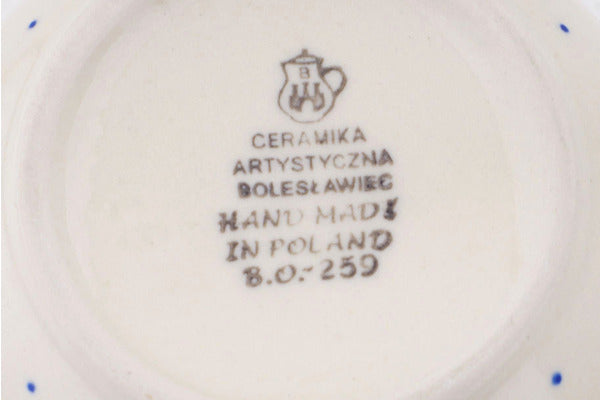 This Polish pottery Mug is made by Ceramika Artystyczna workshop in Boleslawiec, Poland. Manufacturer item number H9182Q. It is 3¾" high and measures 6¼" by 4½". The capacity of this Mug is 20.0 oz when filled to rim and it weighs 1.1 lbs. It is part of the Hatched Collection.