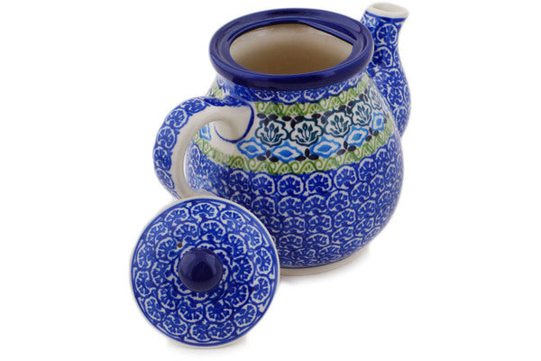 This Polish pottery Tea or Coffee Pot is made by Ceramika Artystyczna workshop in Boleslawiec, Poland. Manufacturer item number H5683Q. It is 6" high and measures 6¾" by 4½". The capacity of this Tea or Coffee Pot is 20.3 oz when filled to rim and it weighs 1.3 lbs. The pattern was designed by artist Maria Starzyk. It is part of the Artistic Boho Collection.