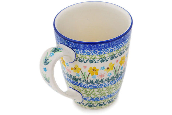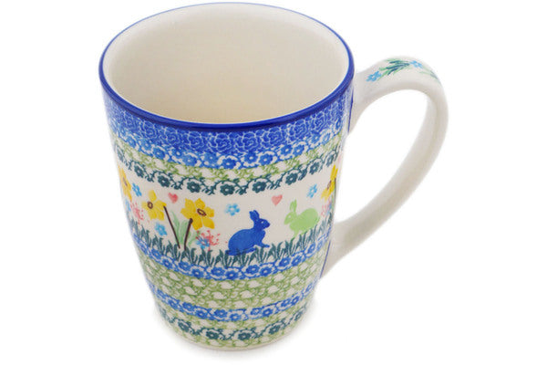 This Polish pottery Mug is made by Ceramika Artystyczna workshop in Boleslawiec, Poland. Manufacturer item number H9030Q. It is 5" high and measures 5¾" by 4". The capacity of this Mug is 22.3 oz when filled to rim and it weighs 1.3 lbs. It is part of the Hopping In Love Collection.