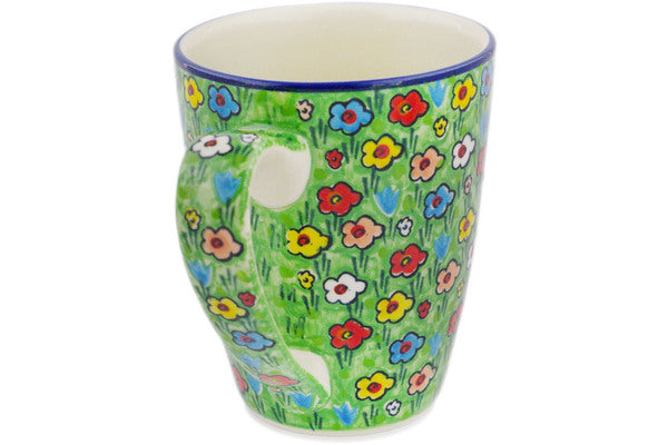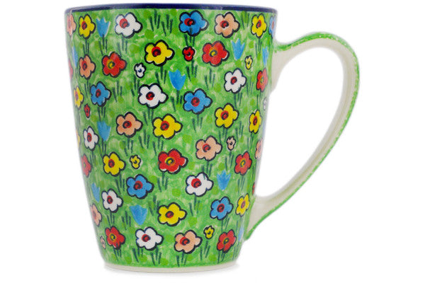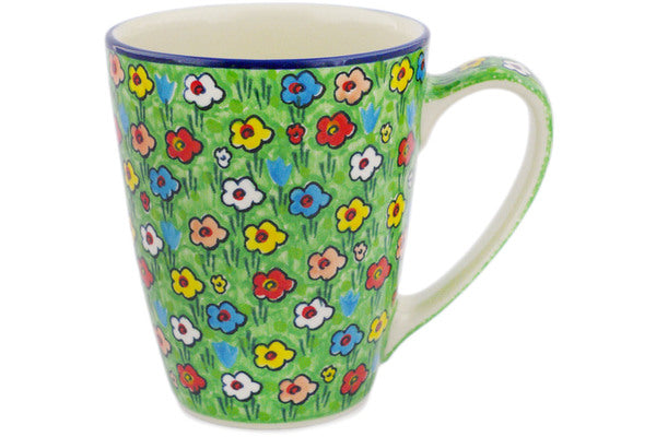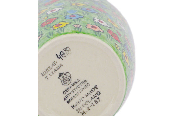 This Polish pottery Mug is made by Ceramika Artystyczna workshop in Boleslawiec, Poland. Manufacturer item number H2947R. It is 5" high and measures 5¾" by 4". The capacity of this Mug is 22.3 oz when filled to rim and it weighs 1.3 lbs. It is part of the Whimsical Garden Collection.