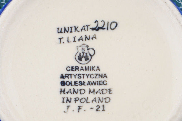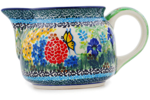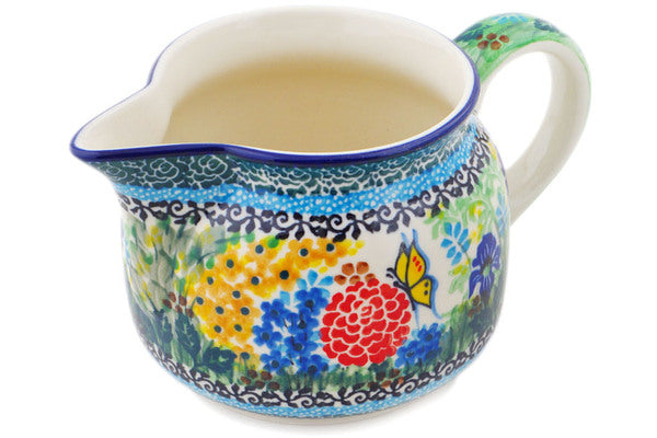 This Polish pottery Pitcher is made by Ceramika Artystyczna workshop in Boleslawiec, Poland. Manufacturer item number H6602Q. It is 4" high and measures 7½" by 5". The capacity of this Pitcher is 23.7 oz when filled to rim and it weighs 1.1 lbs. The pattern was designed by artist Teresa Liana. It is part of the Spring Garden Collection.