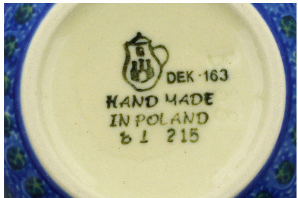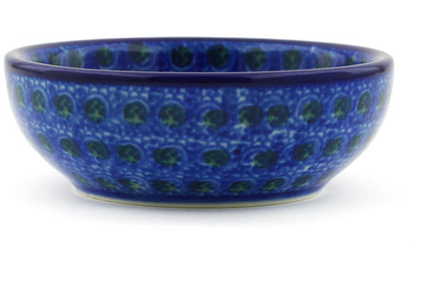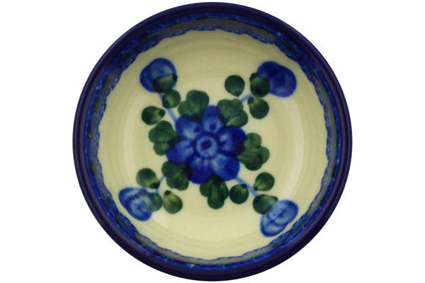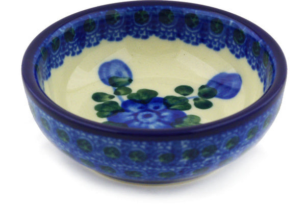This Polish pottery Bowl is made by Ceramika Artystyczna workshop in Boleslawiec, Poland. Manufacturer item number H6590F. It is 1¼" high and measures 3½" by 3½". The weight of this Bowl is 0.3 lbs. The pattern was designed by artist Jolanta Okraska. It is part of the Blue Poppies Collection.