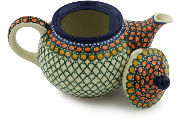 This Polish pottery Tea or Coffee Pot is made by Ceramika Artystyczna workshop in Boleslawiec, Poland. Manufacturer item number H1511H. It is 5¼" high and measures 8¼" by 5". The capacity of this Tea or Coffee Pot is 30.4 oz when filled to rim and it weighs 1.4 lbs. The pattern was designed by artist Teresa Liana. It is part of the Orange Tranquility Collection.