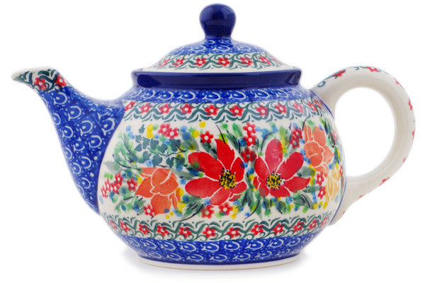 This Polish pottery Tea or Coffee Pot is made by Ceramika Artystyczna workshop in Boleslawiec, Poland. Manufacturer item number H0108M. It is 5¼" high and measures 8¼" by 5". The capacity of this Tea or Coffee Pot is 30.4 oz when filled to rim and it weighs 1.4 lbs. The pattern was designed by artist Barbara Fidelus. It is part of the Red And Yellow Flowers Collection.