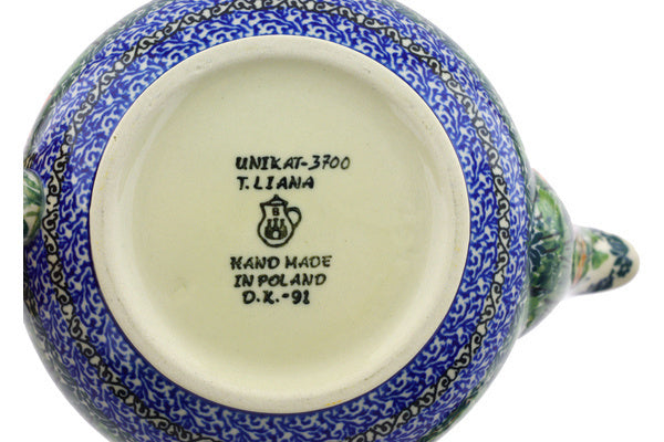 This Polish pottery Tea or Coffee Pot is made by Ceramika Artystyczna workshop in Boleslawiec, Poland. Manufacturer item number H3645G. It is 5¼" high and measures 8¼" by 5". The capacity of this Tea or Coffee Pot is 30.4 oz when filled to rim and it weighs 1.4 lbs. The pattern was designed by artist Teresa Liana. It is part of the Splendid Meadow Collection.