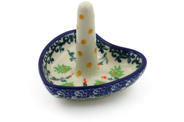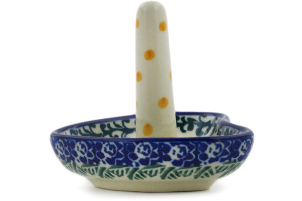 This Polish pottery Ring Holder is made by Ceramika Artystyczna workshop in Boleslawiec, Poland. Manufacturer item number H2633I. It is 3¼" high and measures 3¼" by 3¼". The weight of this Ring Holder is 0.2 lbs. The pattern was designed by artist Ewa Karbownik. It is part of the Limon Fields Collection.
