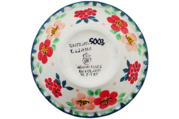 This Polish pottery Scalloped Bowl is made by Ceramika Artystyczna workshop in Boleslawiec, Poland. Manufacturer item number H3560O. It is 1¼" high and measures 3½" by 3½". The capacity of this Scalloped Bowl is 2.6 oz when filled to rim and it weighs 0.2 lbs. The pattern was designed by artist LIANA TERESA. It is part of the Pink Divinity Collection.