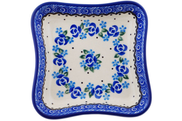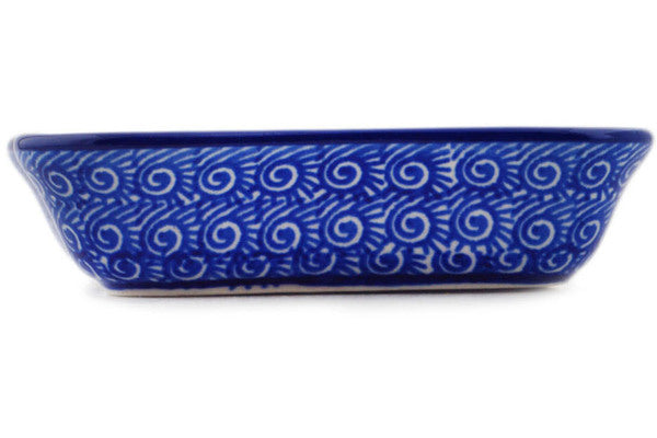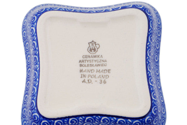 This Polish pottery Bowl is made by Ceramika Artystyczna workshop in Boleslawiec, Poland. Manufacturer item number H5107Q. It is 1¼" high and measures 4½" by 4½". The weight of this Bowl is 0.5 lbs. The pattern was designed by artist Maria Starzyk. It is part of the Blue Bud Sea Collection.