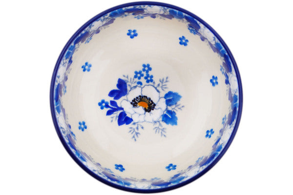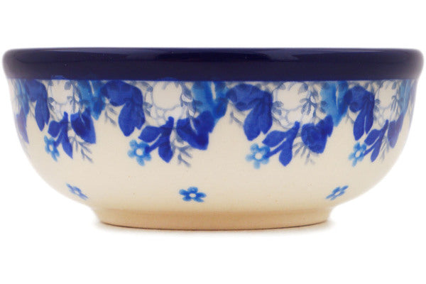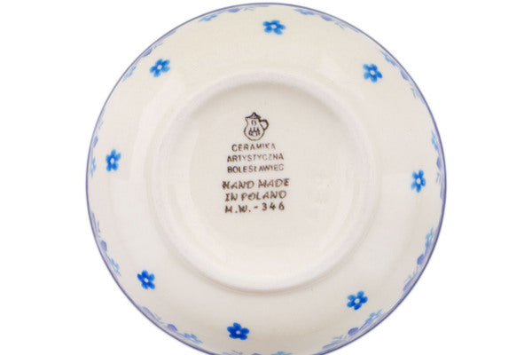 This Polish pottery Bowl is made by Ceramika Artystyczna workshop in Boleslawiec, Poland. Manufacturer item number H9487Q. It is 1¾" high and measures 4¼" by 4¼". The capacity of this Bowl is 6.8 oz when filled to rim and it weighs 0.4 lbs. It is part of the Blue Spring Collection.