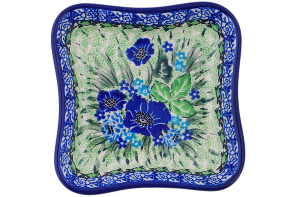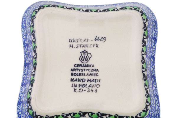 This Polish pottery Bowl is made by Ceramika Artystyczna workshop in Boleslawiec, Poland. Manufacturer item number H6936Q. It is 1¼" high and measures 4½" by 4½". The weight of this Bowl is 0.5 lbs. The pattern was designed by artist Maria Starzyk. It is part of the Moody Blues Collection.