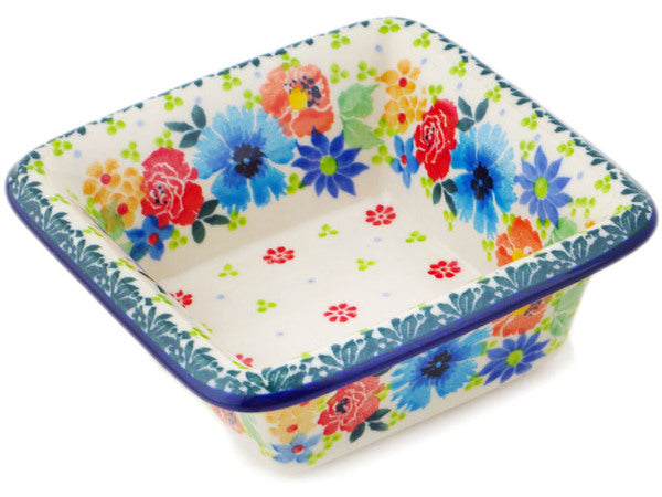 This Polish pottery Bowl is made by Ceramika Artystyczna workshop in Boleslawiec, Poland. Manufacturer item number H8523O. It is 1¾" high and measures 4½" by 4½". The capacity of this Bowl is 5.9 oz when filled to rim and it weighs 0.7 lbs. It is part of the Wreath Of Life Collection.